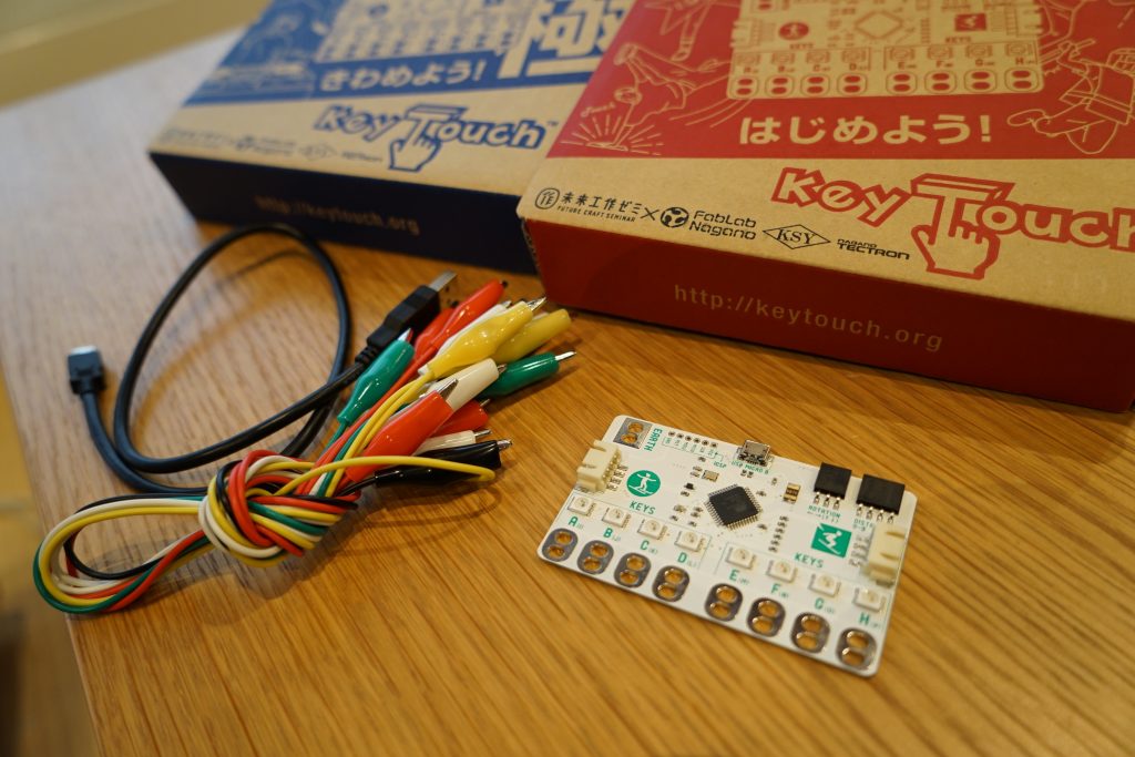 『KeyTouch(キータッチ)』は繋げたものを入力装置に変えてしまうクリエイティブ心をくすぐるような電子基板で、FabLab Nagano・株式会社KSY・未来工作ゼミ(アソビズムの共育事業プロジェクト)の産学協同で開発した、made in 長野の発明・プログラミング学習ツールです。