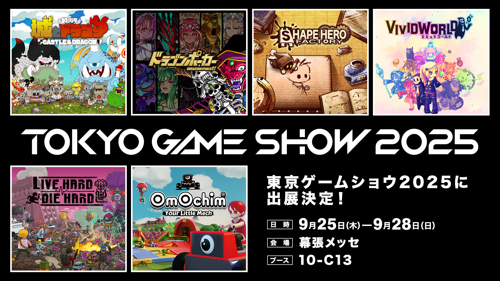 『城とドラゴン』『ドラゴンポーカー』に加え、PC・コンソール向け最新作『ShapeHero Factory』『Vivid World』『Live Hard, Die Hard』『OmOchim』を出展し、当社の多様な開発ラインナップを来場者の皆さまにご覧いただきました。