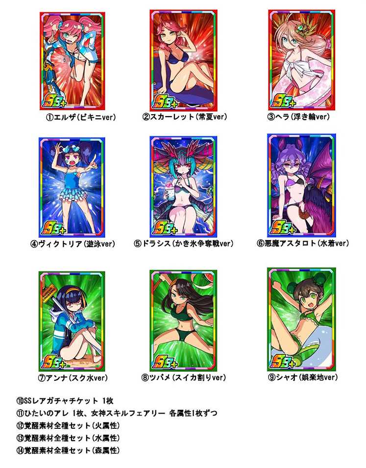 期間中、ログインすると、竜石や「SSレアガチャチケット」「女神スキルフェアリー」「天輝ジェムマローン」など、豪華アイテムが毎日ランダムでもらえる「残暑見舞いプレゼントキャンペーン」を開催いたします。さらに、対象の中から好きなアイテムを1つもらえる「残暑見舞い水着キャラプレゼントキャンペーン」も同時開催!『ドラゴンポーカー』に毎日ログインして、豪華報酬を受け取りましょう!