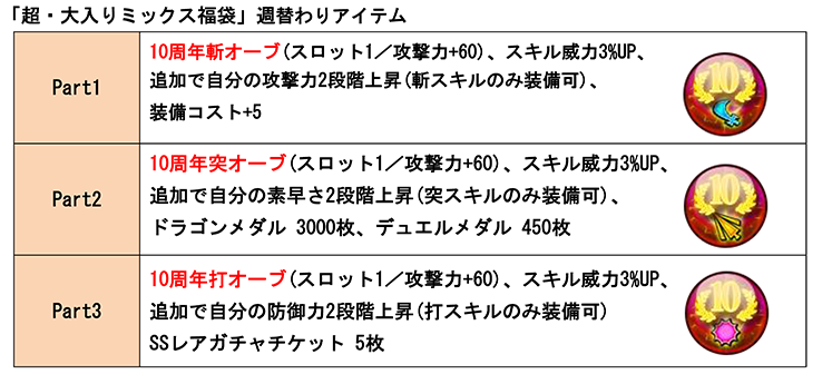 SSレアカードや豪華なアイテムが手に入る「10周年記念福袋ガチャ」が、3週間限定で登場いたします。この「10周年記念福袋ガチャ」は週毎にアイテムが替わります。「超・大入りミックス福袋」と各属性(火・水・森)の「大入り属性別福袋」があり、1週ごとに各福袋をお一人様1回限定で購入することができ、3週間合計で最大6回購入できます。
