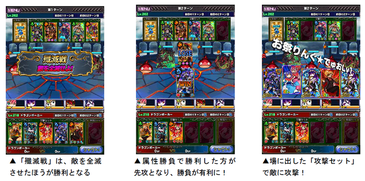 デュエルマッチは、3ターンで1戦が完結し、1vs1で遊べるリアルタイム対人バトルです。バトルには「殲滅戦」「防衛戦」「争奪戦」と3種類のルールがあり、本戦では開催回ごとに、特効スキルとバトルの種類が変わります。